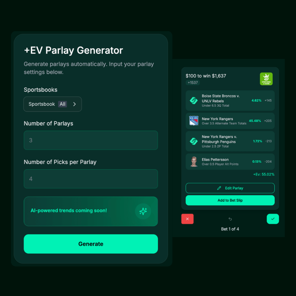 The +EV Parlay Generator transforms the way you create parlays, making it easier than ever to build profitable combinations. By automating the search for +EV bets and simplifying the parlay building process, you can focus on what matters most: making smart betting decisions. And now that you understand the mathematical edge behind +EV parlays, you can use this tool with confidence, knowing you’re applying sound betting principles to maximize your potential returns.