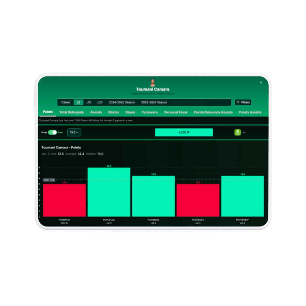 Scroll down to explore relevant supporting stats that might influence the bet’s outcome. For an NBA player total points prop bet, you’ll see key metrics like:
